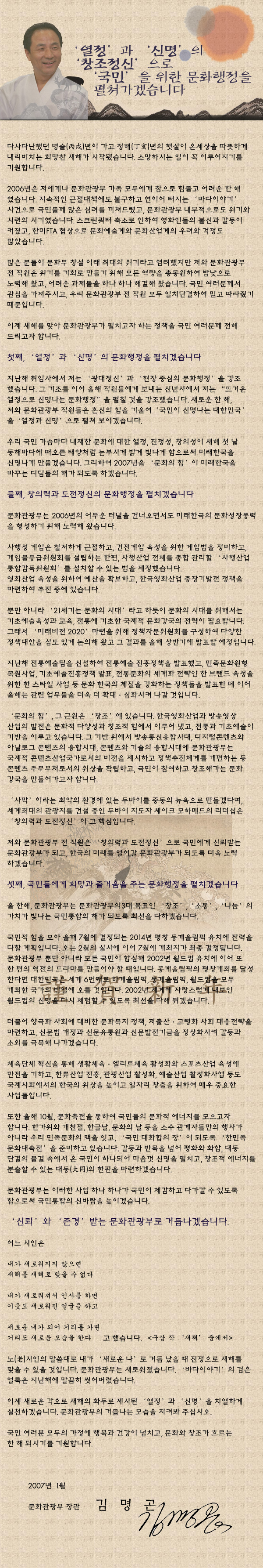 김명곤 장관은 2007년도 문화부의 역점 추진방향에 대해 “‘열정’과 ‘신명’의 ‘창조정신’으로 ‘국민’을 위한 문화행정을 펼치겠다”는 포부를 밝혔다. 김장관은 지난해 3월 취임 때 ‘광대정신’과 ‘현장 중심의 문화행정’을 강조했던 것을 상기하며 새해에는 이를 보다 발전시켜 나가기 위해 “문화부 직원들에게 신년사에서 ‘뜨거운 열정으로 신명나는 문화행정’을 펼쳐나가자고 강조했다”고 소개했다. 김장관은 “올해는 ‘문화의 힘, 미래 한국을 바꿉니다’라는 문화부 비전이 사회적으로 널리 퍼지고, 국민과 함께 신명나는 대한민국을 만드는 한해가 되도록 최선을 다하겠다”고 밝혔다. (붙임 참고 : 김명곤 장관 신년사)