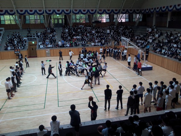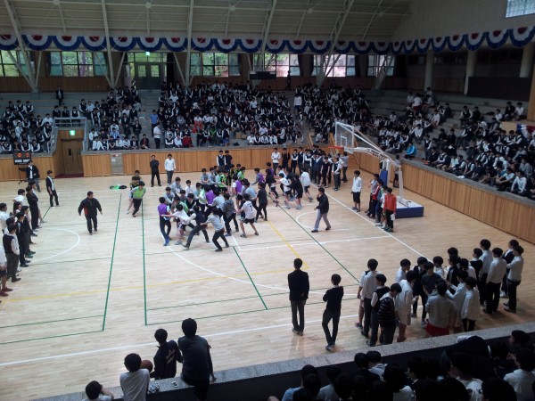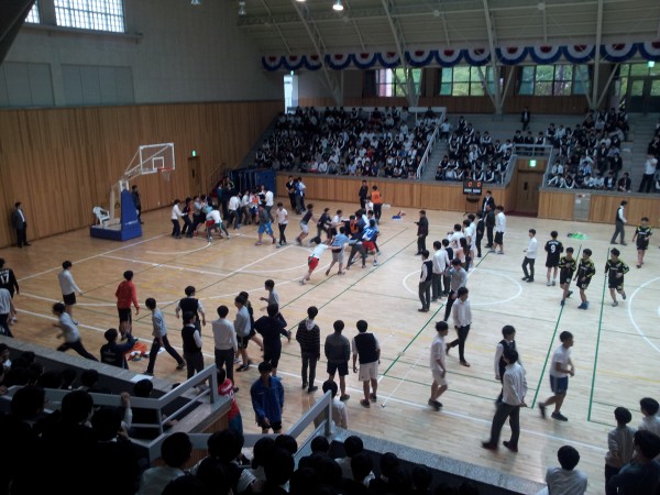 체육관에서 꼬리잡기, 닭싸움, 농구 등으로 대신했다.